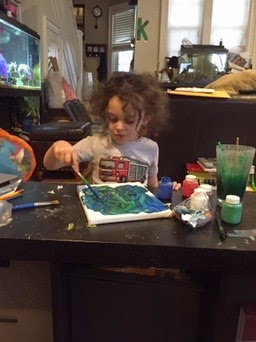 You played in the green room for most of the day, and then when Steph got home, you painted her a birthday painting! You were "fish-ed" like four or five times...all of them absolutely beautiful. You mixed those colors all by yourself! I understand that you're three. I understand that I think that you poop rainbows and flower petals... I don't think it's just those "facts" I have about you that make me think you're really quite talented in your use of color! Like...you just INVENTED TEAL! :)